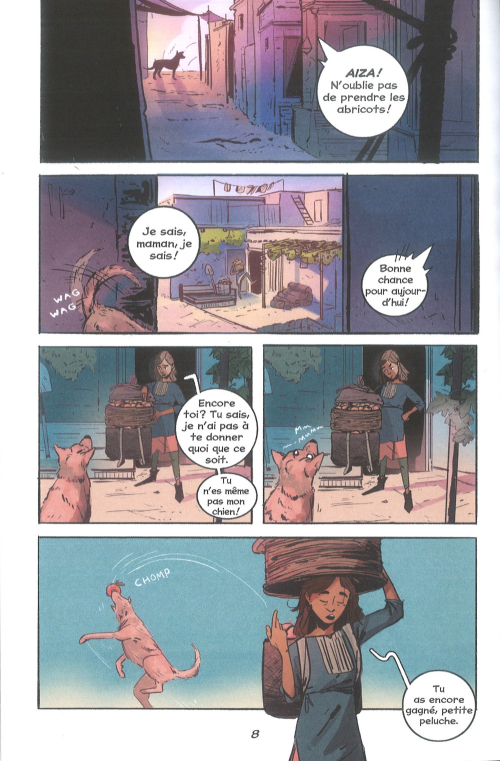 La partition graphique de Sara Alfageeh se révèle globalement réussie. Empruntant au comics et au manga, son trait semi-réaliste se montre expressif, tandis que l’agencement des cases et la variété des cadrages assurent une bonne immersion. Par ailleurs, si certaines proportions sont exagérées (la main tellement minuscule d’Azia dans celle gigantesque du vieux gardien manchot), le travail sur l’ambiance moyen-orientale s’avère appréciable, qu’il s’agisse des costumes (aux influences ottomanes) ou des décors. Certaines séquences font particulièrement mouche, notamment la scène des lettres qui invite à mieux connaître le quatuor d’aspirants chevaliers.