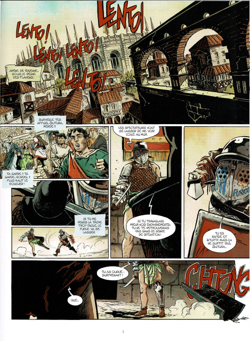 De caractères opposés, mais complémentaires, les héros entrent en scène de la meilleure manière qui soit : dans la poussière, la sueur, l’effort et sous les cris d’une foule de spectateurs. Les présentations faites et quelques enjeux posés, le récit peut se dérouler, rythmé et sans temps mort. Les événements s’enchainent, bousculant la paire de lutteurs et l’entrainant de Charybde en Scylla, tandis qu’action et affrontements avec des soudards vont crescendo. Dans cet épisode, la démonstration de force brute semble l’emporter sur la réflexion ; toutefois, en dehors de quelques échanges de piques, les dialogues fournissent leur lot d’informations, notamment sur divers aspects du monde des gladiateurs (armes, condition physique, entraînement, popularité) et sur les intérêts des protagonistes. Puis, l’alternance entre les voix-off de Lento et Sutura apporte le point de vue de chacun, tout en éclairant leur relation.