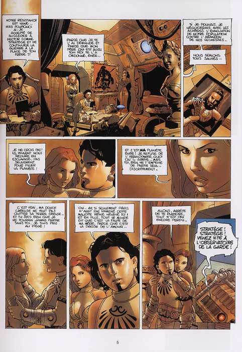Quant au dessin, d'aucun pourrait lui reprocher une certaine raideur dans le rendu du mouvement et dans les expressions faciales. Ce qui pourrait apparaître là-bas comme une faiblesse sert en fait ici adroitement l'histoire en renforçant l'impression d'assister à une représentation théatrale d'une tragédie antique. Un autre point assez remarquable consite dans le mélange réussi, tout comme dans "Le Fleau des Dieux", entre éléments antique (hoplite, galère, cheval de Troie) et éléments futuristes (fusil laser, vaisseaux spatiaux, planète-monde).