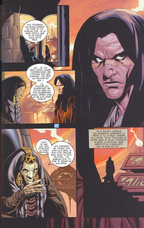 Ce choix éditorial n’a, pour le moment, que très peu d’influence sur la lecture, celle-ci étant tout à fait accessible aux non-initiés. Vu que le héros est amnésique, les explications, que l’on reçoit en même temps que lui, viennent bien à point afin de se situer dans le monde imaginé par Georges Lucas (et bien d'autres auteurs...). L’intrigue, tout en drainant les grands thèmes des films (amitié, confiance, trahison, tentation, corruption et justice), parvient à susciter l’intérêt du lecteur via la lente progression des deux héros dans leur recherche de la vérité. Parmi les nombreuses personnalités qui traversent ce récit, deux se distinguent du lot : Quinlan Vos, chevalier déboussolé par sa perte de mémoire et qui ne peut supporter une situation qu’il ne contrôle pas (comme un certain Anakin, mais n’anticipons pas...) et Villie, mercenaire devaronien, faussement naïf et dont on se demande quel coup tordu il a pu encore échafauder. Comme l’histoire tourne quasi-exclusivement autour de ces deux protagonistes, les auteurs ont pris le temps de développer avec finesse leur personnalité bien trempée.