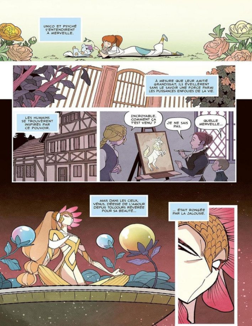 Assurément connaisseur de l’œuvre originale, le scénariste en reprend les grandes lignes et rassemble certains éléments afin d’offrir un récit à plusieurs fils. Après une rapide entrée en matière présentant le personnage principal, les raisons de son exil forcé hors du Jardin Céleste et sa rencontre avec Chloé, l’auteur s’attarde sur la vie dans la maisonnette à l’écart de la ville et sur l’usage des pouvoirs d’Unico. En parallèle, il montre le difficile parcours de Zéphir pour aider son protégé et le sortir, à distance, de la spirale temporelle dans laquelle celui-ci a été plongé. D’autres figures – parfois directement empruntées à l’œuvre de Tezuka - sont intégrées au puzzle et remplissent leur rôle avec plus ou moins de bonheur. Ainsi, alors que Byron, le chasseur obnubilé par les trophées, ne manque pas de s’imposer comme un adversaire dangereux, le Vent de la nuit, sbire de la déesse de la beauté, paraît beaucoup plus anecdotique. Pour autant, le récit se révèle équilibré et globalement bien mené.