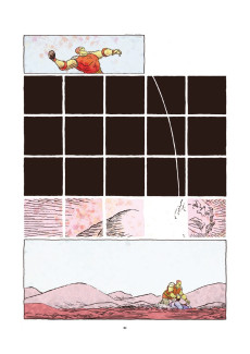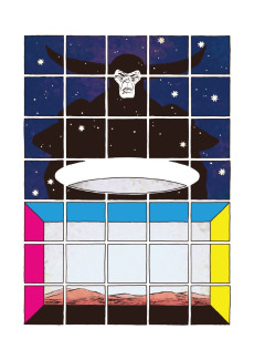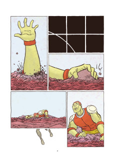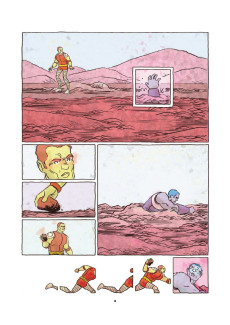 L’ouvrage est un bel objet – comme savent les proposer les éditions 404 – et, surtout, une pépite graphique. Les phylactères sont rares et l’aventure avant tout visuelle. Avec son style reconnaissable, notamment dans les traits des personnages, le dessinateur d’Arca ou la nouvelle Eden s’accorde une liberté totale. Il renouvelle les mises en pages originales, jeux avec les espaces inter-iconiques initiés dans Hedra (paru en France en 2025 mais il y a déjà plusieurs années en version originale). Le résultat ne ressemble pas à une expérimentation balbutiante mais relève, plutôt, de l’appropriation absolue du medium, de la compréhension parfaite de ce qui est le cœur du Neuvième Art. Tout comme les choix de composition, celui des couleurs est au service de ce que ce comic book a à raconter. Leur rôle est évident et assumé, dès l’ouverture, le bleu, le rouge et le jaune (les couleurs primaires) donnant même leur nom aux trois premiers chapitres (sur cinq). Merveilleusement appliquées, les teintes achèvent l’immersion dans cet univers si particulier.