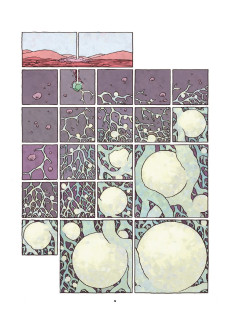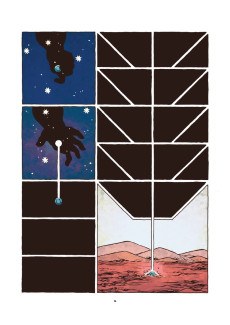 Mais les péripéties ne sont ni vaines ni gratuites. Elles sont le support d’un propos bien plus profond sur l’origine du monde. Attentif, le bédéphile y verra aussi de nombreux questionnements et partis pris sur les fondements des sociétés organisées, l’essentialisme, la foi ou la nature humaine. Les niveaux de lecture semblent se multiplier, se croiser, se chevaucher pour finalement, irrémédiablement, converger et constituer un tout cohérent et bien plus structuré qu’il peut y paraître à première vue. Car Drome est de ces livres exigeants, qui se révèlent progressivement, qu’il faut lire, puis relire, pour en appréhender toutes les subtilités et en apprécier la complexité.