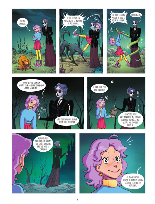 Avec sa chevelure mauve et vêtements bariolées qui tranchent avec l’ambiance sépulcrale qui l’entoure, Violette Ténébris a un furieux air d’Enid Sinclair, la pétillante louve-garou amie de Mercredi Addams, dans la série télévisée réalisée par Tim Burton. Coïncidence ou clin d’œil ? Difficile à dire. Néanmoins, l’héroïne imaginée par Marie Manand et animée par Flavia de Vita semble prendre le contrepied des figures ultra-gothiques habituelles. Joie de vivre et nuances vives sont son credo, ces dernières faisant tache au milieu des noirs, gris et violets et bordeaux profonds du château. La protagoniste possède tout de l’adolescente classique : un zeste d’impertinence bien sûr, mais aussi l’agitation interne causée par des questionnements existentiels et sa différence visible. Ici, la demoiselle est travaillée par le prérequis qui lui fait cruellement défaut pour devenir une héritière digne de ce nom : la possession d’un animal-totem et des dons magiques. Les personnages et l’enjeu introduits, le récit prend d’abord la forme d’une quête agrémentée de diverses rencontres et péripéties venant étoffer l’univers. Puis, un rebond à la moitié de l’album relance efficacement le scénario et l’oriente vers un dénouement où l’apothéose consiste à s’accepter soi-même, tout en proposant une vraie conclusion pour cette première aventure. Ce choix explique sans doute que les événements s'enchaînent rapidement, sans approfondir certains aspects. En parallèle, le ton se pare d’un humour bon enfant qui rend la lecture plaisante et ne manque pas de faire sourire par moments, comme lorsque le fameux compagnon inséparable est identifié.