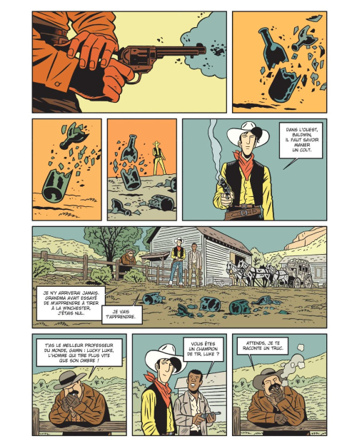 Bien mieux que les albums Lucky Luke! Un dessin magnifique, une narration super intelligente qui met une ambiance très western. Brüno ne faillit pas à sa réputation. On y apprend enfin pourquoi Luke est qualifié de Lucky... et l'enquête en fin d'album est stupéfiante!