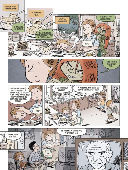 Ici, ce thème est traité d'une manière rarement vue, que seuls les témoins invités parfois en classe racontaient : la manière dont on sort du camp à l’approche des alliés, les marches de la mort, les rencontres avec les soldats russes et anglais, les maladies, la premières fois où une jeune rescapée se regarde dans un miroir après des années passées au camp, le périple des retours et les chocs occasionnés. Au début de l'album, Simone explique ce qui l'a poussée à témoigner, particulièrement l'importance de "contrer la propagande immonde des négationnistes". De manière astucieuse, renforcée par les propos de la postface, le scénariste traite cette thématique et signe scénario remarquable, un sans-faute.