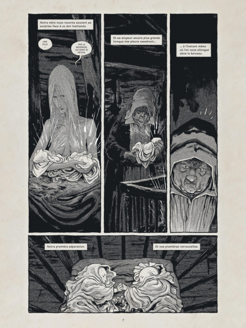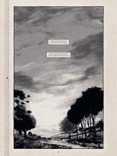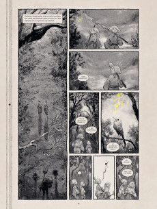 Mais il est temps de parler d’Édouard Cour ! Pour illustrer ce conte, à la fois sombre et lumineux, il a réalisé une partition graphique en tous points exceptionnelle. Ouvrez cet album et feuilletez-en quelques pages pour en être convaincu. Chaque planche est un monde. Avec une maitrise parfaite, il compose un dessin délicat, fourmillant de détails, texturé par une trame mécanique très fine qui donne une profondeur incroyable à ses décors. Ses nuances de gris, notamment, sont d’une grande complexité et luisent d’une inquiétante lueur gothique. Associé à un noir et blanc qui joue souvent d’un clair-obscur expressionniste, l’ensemble est d’une beauté à couper le souffle.