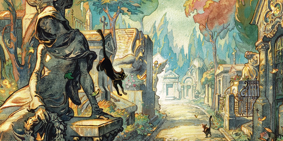 Ici, 16 parcours ou l'on raconte à la fois celui qui est dans le cercueil et la légende autour de la tombe. Chaque histoire parcoure la vie du personnage jusqu'à sa mort puis c'est un chat noir qui parcourt les allées du cimetière pour nous raconter ce qui s'est passait après sa mort, autour de sa tombe et qui l'a rendu éternel.