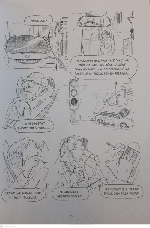 wénaëlle Régereau, autrice et narratrice, rentre à Saint-Brieuc en Bretagne voir ses parents. Le trajet en voiture de la gare à leur maison passe devant l’ancienne usine du joint français. C’est l’occasion pour elle de questionner son père sur l’histoire du lieu et plus particulièrement sur la grève de 1972. Le récit alterne, à partir de là, du présent de l’élaboration de la BD au passé de la lutte sociale.