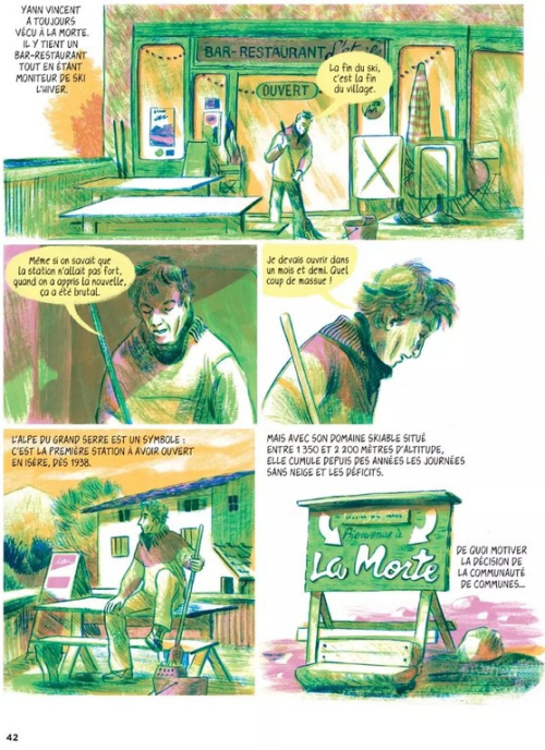 Le thème transverse est, évidemment, le changement climatique qui a des conséquences directes sur tous les aspects de la vie en altitude, principalement la dégradation des milieux accueillant faune et flore, mais aussi la viabilité du tourisme organisé en « tout ski ». Ces enjeux sont traités sous différents angles : l’artificialisation des sols, la politique, la médiatisation, les futurs JOP 2030 prévus dans les Alpes. Toutes ces facettes sont servies par des mises en images variées. Heureusement, le recueil présente aussi des pistes de solutions pour un futur plus optimiste. D’abord en rappelant les résistances locales parfois victorieuses et en proposant des alternatives pour imaginer les activités possibles dans un monde sans neige abondante.