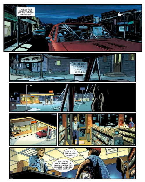 Adaptation du roman du même titre de Randy Kennedy, Presidio est un thriller psychologique organisé en road movie très traditionnel. Personnages très bien caractérisés, un joli mélange entre cynisme, humour et constats humains définitifs, Simon Treins retranscrit parfaitement l’esprit du texte original, le sens de l’espace en moins. En effet, les soixante-dix pages s’avèrent un peu étroites caser «caser» les nombreux sujets abordés par Kennedy. Résultat, là où l’horizon inatteignable, le bruit des roues sur le goudron et la somnolence provoquée par le défilement des kilomètres auraient apporté recul et consistance aux différents échanges et rebondissements, le lecteur a droit à un empilement de scènes de dialogues. Cela est indispensable pour faire avancer l’intrigue, mais se fait au prix du ressenti.