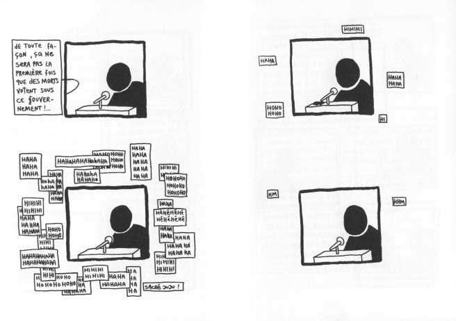 Dans cet album particulièrement atypique, Ibn Al Rabin dresse un portrait accablant de l’homme et de sa relation avec tout ce qui lui est étranger. Mais il ne le fait pas de manière ennuyeuse et n’a jamais recours au reproche : il se contente de démontrer l’évidence de ce mal qui nous ronge. S’appuyant sur des zombies particulièrement humains et touchants, il parvient à faire passer son message avec un détachement et un humour qui se passent de tout commentaire. Une prouesse d’autant plus impressionnante que son dessin se résume à quelques silhouettes jetées semble-t-il négligemment sur des pages nageant elles-même dans la plus joyeuse confusion. Mais tout cela n’est qu’apparence car tout est en fait conçu pour permettre une lecture des plus fluides. La particularité de la mise en page et du graphisme est vite oubliée tant la narration est maîtrisée et le récit captivant.