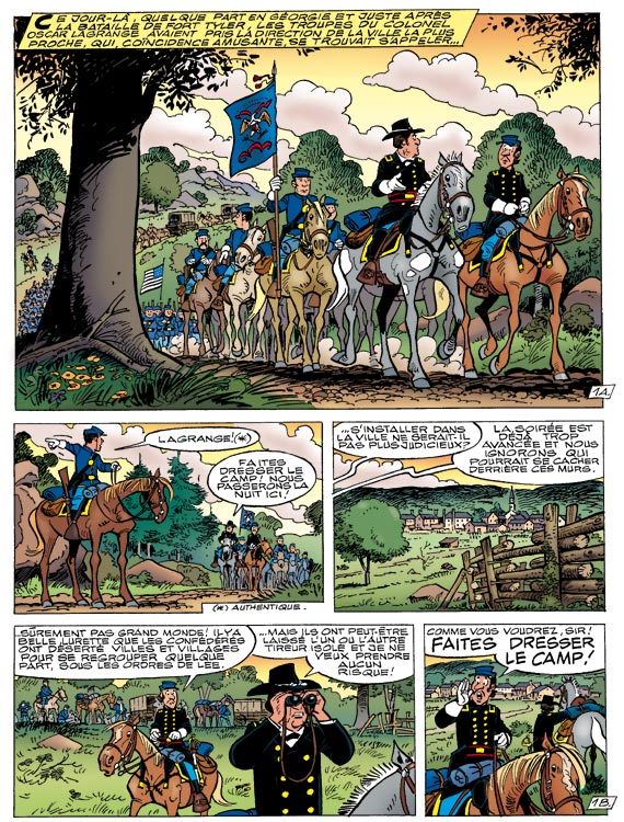 S’inspirant d’un fait réel (les Nancy Hart sont une milice de femmes sudistes, créé en 1861 afin de protéger leur ville de LaGrange), Cauvin et Lambil mélangent réalité historique et pure fiction avec sagacité et efficacité. Ils nous délivrent ainsi un récit amusant dans lequel les préjugés machistes en prennent pour leur grade. Fidèle à l’esprit de la série, ce récit décrit une journée pendant laquelle cette armée d’hommes, si sûr d’eux-mêmes, se demande comment ils vont pouvoir mettre au pas ces Nancy Hart. Quant à nos deux compères, vous vous en doutez bien, ils seront aux premières loges, quitte à être les dindons de la farce.