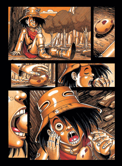 Dream est un conte sans parole. Son scénario paraît assez léger, ou du moins très simple. Pourtant le message de l’auteur est percutant à cause du brusque passage d’un univers onirique et merveilleux dans les tons orangés et marrons, à un autre, plus réel, en noir et blanc. La volonté du duo formé par le garçon et son cochon de s’évader de leur quotidien et de la misère dans laquelle ils vivent, prend corps dans le songe qu’ils font conjointement. Tout est étonnant, possible et les richesses désirées, dépassant même les rêves les plus fous, sont à portée de main. La dégringolade qui suit est d’autant plus rude qu’elle est introduite par de trop grandes avidité et curiosité, comme dans les récits traditionnels. La réalité sans couleur dans laquelle s’éveillent les compères a tout d’un cauchemar. Les six dernières pages sont empreintes d’une cruauté sombre et déprimante que le dénouement comique fait résonner douloureusement.