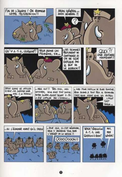 u milieu de la jungle africaine, un camp militaire ultra discipliné de commando-éléphants (la 8ème PEA, Patrouille Eléphantesque d'Assault) accueille des réfugiés herbivores fuyant un complot humano-carnivore aux desseins pas très catholiques. Voici le cocktail de Panique dans la brousse, suite de l'hilarant La mission infernale réédité en couleur l'année dernière chez petit à petit.