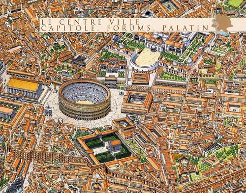 Ouvrage impressionnant s’il en est, Dans la Rome des Césars est avant tout l’œuvre d’un passionné de l’histoire avec un grand H: Gilles Chaillet, créateur entre autre de Vasco et La Dernière Prophétie, a aussi participé aux séries Les Voyages d'Alix, Lefranc et Le Triangle Secret. Après un travail titanesque (plus de 8000 heures de travail selon l’éditeur), Chaillet a dessiné une carte immense (3,25 m sur 2 m) de la Rome du IVème siècle, décrivant avec une précision d’historien rues et bâtiments. Avec un souci permanent de didactisme, l’auteur nous plonge, quartier par quartier et au fil des pérégrinations de Flavien, dans cette immense carte : des thermes de Caracala au palais du Sessorium en passant par les nombreux forum, la visite guidée sera totale et accompagnée de nombreuses anecdotes sur l’histoire du lieu visité, ainsi que sur les us et coutumes de ses habitants. Agrémenté de nombreuses photographies et dessins, le texte favorise une immersion totale dans la Rome de Constantin et, si jamais vous vous perdez dans ce dédale de rues, la carte (aux dimensions plus réduites que l’originale) vous aidera à vous y retrouver et avoir une vue d’ensemble de la Capitale.