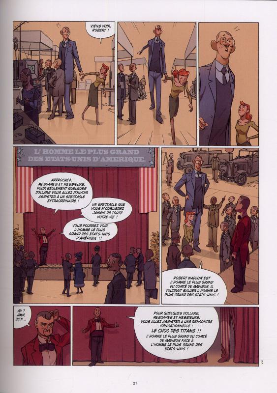 C’est toute une existence qui est résumée en l’espace de 62 planches, et il faut reconnaître que le rythme en pâtit parfois. D'un point de vue narratif, il n’est pas rare que les différents épisodes s'enchaînent de manière heurtée. Ce bémol mis à part, l’auteur parvient à retranscrire habilement la trajectoire de Wadlow tout en lui conférant une personnalité attachante. Sa taille aidant, le personnage renvoie dans un premier temps une image de force et de solidité face aux épreuves, mais, rapidement, il affiche une fragilité sans cesse plus tangible, comme si l’attention constante dont il fait l’objet se soldait par toujours plus de fêlures. Le sujet, délicat par ses nombreuses implications sur la société et la façon qu’elle a de mettre à son ban tous ceux qui s’éloignent de la norme, est traité avec tact et respect par Christophe Bec, dont le récit dégage beaucoup de tendresse.