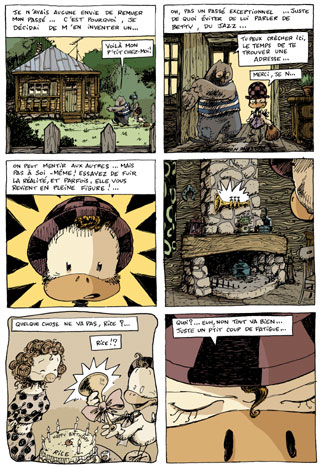 L’album est copieux, le trait idéal pour le thème traité et les couleurs sont à l’unisson. Le parti-pris d’un découpage à six cases par page n’exclut pas les surprises et les transitions entre les morceaux, euh les chapitres prennent la forme de bien jolis intermèdes. La coda non plus ne manquera pas de surprendre. Par L. Cirade
