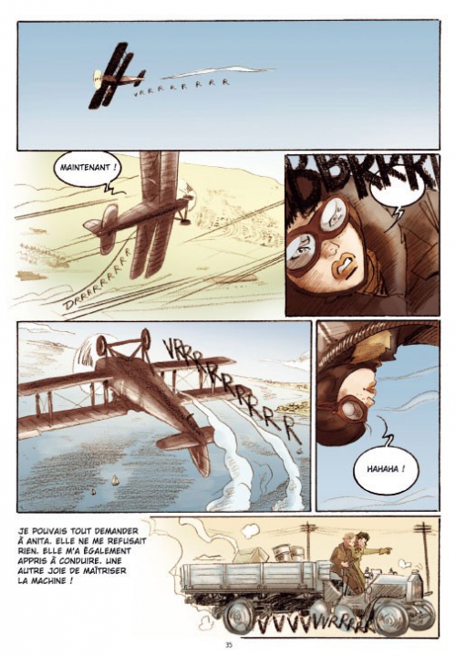 À l'image de Nungesser (Fred Bernard et Asyen chez Casterman) et de L'enragé du ciel (Joseph Safieddine et Loïc Guyot chez Sarbacane) parus l'an dernier, les biographies de pilotes donnent souvent lieu à des bandes dessinées de qualité. Et Amélia Première dame du ciel n'échappe pas à la règle. Il faut dire que la vie de cette aventurière vaut le détour : femme de tête, elle fut une pionnière dans l'aviation et n'eut de cesse de repousser les limites et d'explorer les cieux. S'attachant à la longue liste de ses exploits sans s'attarder outre mesure sur son enfance, Arnü West opte pour un récit à la première personne. Il en découle une narration saccadée, voire par moments hachée, mais d'une force indéniable. Toutefois, loin d'en faire une simple énumération, le scénariste parvient à mettre du liant entre ses prouesses. Suivant un ordre chronologique, il égrène les événements marquants de la vie de son héroïne, notamment le baptême de l'air en 1920 qui servit de déclencheur et éveilla en elle cette folle passion (deux ans plus tard, elle battait son premier record !). Il décrit également ce qui anime Amélia «Meelie» Earthart : une volonté farouche de montrer aux hommes et au monde que ces exploits étaient aussi à la portée des femmes. Féministe donc - elle participa à la création de The Ninety-Nines Inc., l'association internationale des femmes pilotes - mais pas seulement. L'importance que joua sa rencontre avec George P. Putnam, qu'elle épousa en gardant son nom de jeune fille, est également mise en avant. La relation qui les unit sert ainsi de fil rouge au récit, montrant l'opposition des caractères, lui en charge de financer les expéditions de son épouse, pragmatique et un rien affairiste, elle entièrement absorbée par sa soif d'aventures.