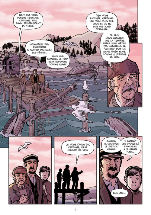 Mocha Dick, publié initialement au Chili en 2013, est le premier scénario pour la bande dessinée de Francisco Ortega, journaliste, enseignant et écrivain. C’est son compatriote, Gonzalo Martinez, architecte, trompettiste de jazz et professeur, qui se charge du dessin. Pour l’un comme pour l’autre, cet album est la première de leurs œuvres publiée en français. Ils ne proposent pas ici une énième adaptation du monument d’Herman Melville (1851), mais remontent à la source de l’histoire, c’est-à-dire au récit que Jeremiah Reynolds fit paraitre dans le Knickerbocker Magazine en 1839, après l’avoir entendu narré par les indiens du Chili. Le jeu de cache-cache et la joute entre Mocha Dick et les chasseurs prennent ici une dimension mystique et colonialiste. En effet, dans ce conflit, l’enjeu n’est pas seulement une proie de plus, mais une lutte entre les peuples, une confrontation entre avidité pécuniaire et préservation d’une certaine harmonie du monde, l’amitié contre la vengeance.