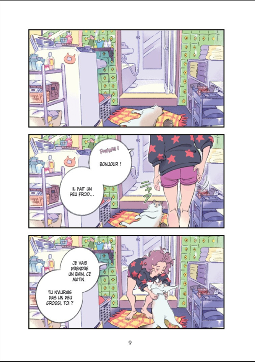 Profiter d’un bon bain, cuisiner, s’occuper de plantes vertes, s’imaginer entourée de méduses, rêver de voler, se faire belle pour un rendez-vous ou juste pour le plaisir, les demoiselles se laissent aller dans la douce intimité de leurs intérieurs joliment décorés, sous le regard de leurs animaux de compagnie. L’ouvrage rassemble ainsi neuf courtes bandes dessinées, de trois à six planches – faisant office d’instantanés -, et des illustrations correspondant à chaque cocon visité. Le dessin, mignon et coloré, met l’accent sur les décors et vêtements, richement détaillés et agréablement colorés, sans négliger pour autant l’expressivité des personnages féminins, des chats et du chien, dont les caractères font l’objet de pages supplémentaires.