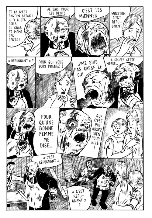 Paru originellement en 2014, Les amateurs est un album étrange dans lequel Conor Stechschulte propose un récit déconstruit oscillant entre horreur et banalité d’une journée comme les autres. D’un côté, des extraits d’un journal intime tenu par Annie M. Nemeth décrit quelques évènements banals et un incident particulièrement peu ragoûtant (la découverte d’un cadavre sur les berges du cours d’eau local). De l’autre, les mésaventures grand-guignolesques de garçons bouchers amnésiques contraints de servir une clientèle impatiente. Les deux fils narratifs sont-ils reliés ? Jim et Winston auraient-ils à voir avec le corps découvert par Annie ? Bien futé celui qui pourra le dire. En effet, l’auteur laisse le soin au lecteur d’imaginer ce pan de cette histoire lynchienne ou presque.