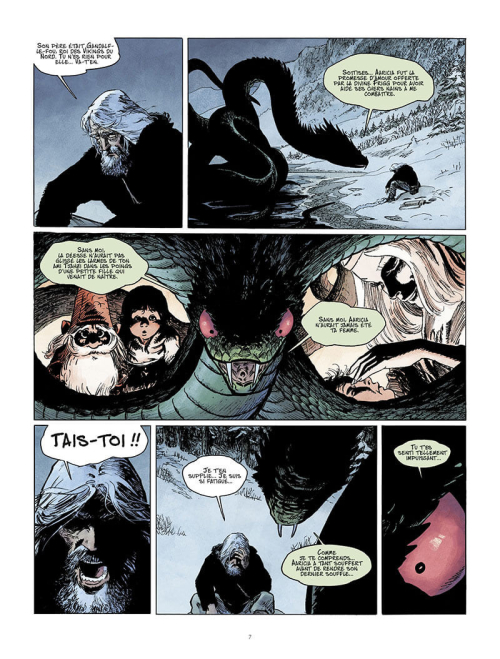Et c’est peut-être sur ce point qu’il faut allez chercher la paille dans l’œil d’Odin. Pas de souci, du côté du viking découvert dans le Journal de Tintin un matin de mars 1977 ; il est, comme à son habitude, remarquable dans son rôle d’intercesseur : de négociateur entre dieux et mortels, père et mari irréprochable, figure de droiture dans un monde brutal. L’intrigue, bâtie sur une malédiction tout ce qu’il y a de plus classique, tient la route même si elle ne cherche pas à désarçonner le lecteur, et la petite charge contre la cupidité passe sans forcer le trait. Ce sont plutôt les monologues, les pensées qui s’échappent des crânes, surtout dans les premières pages, qui sonnent parfois un peu faux, comme si la voix de Thorgal et des siens hésitait à se caler sur le timbre originel. Pas de quoi décorner cependant la chèvre qui fait la fierté de celui dont la prochaine mission consistera à construire une bergerie.