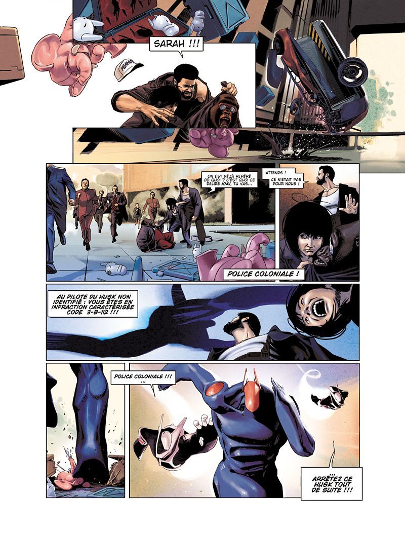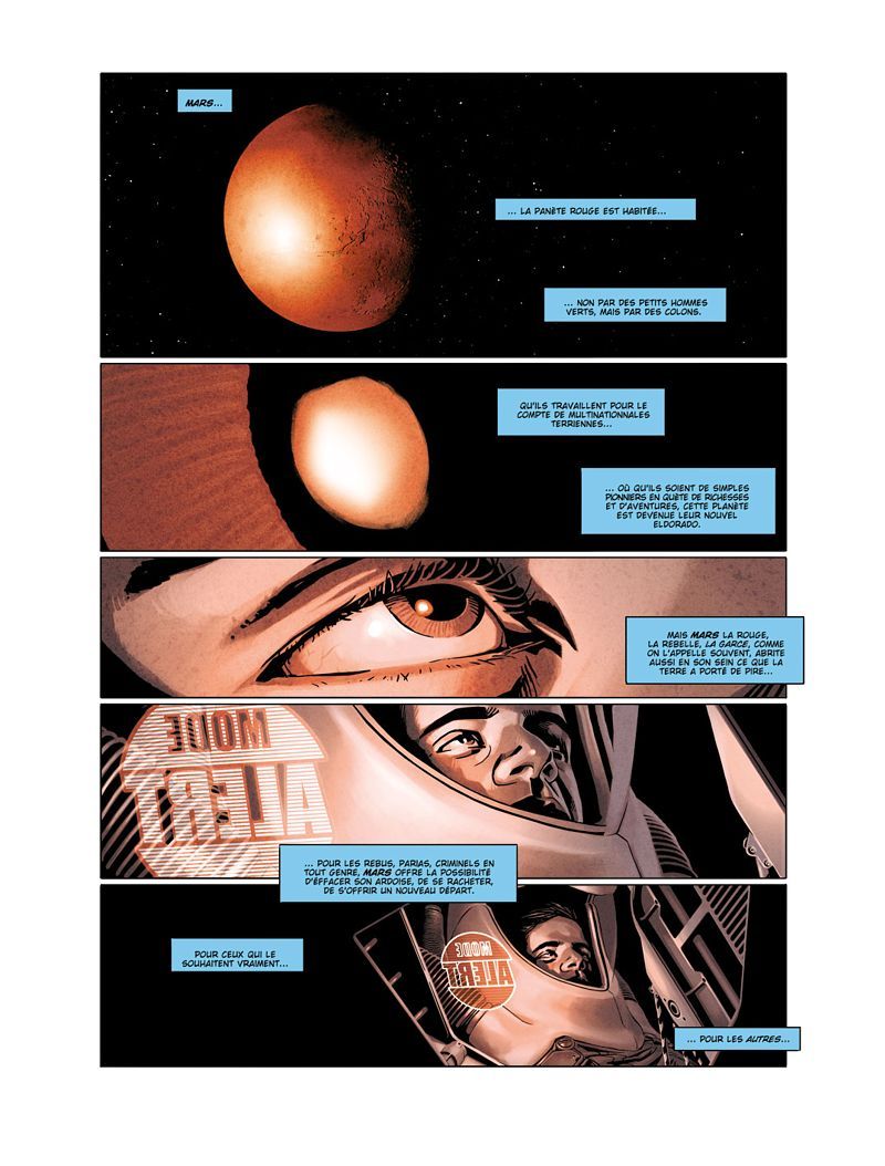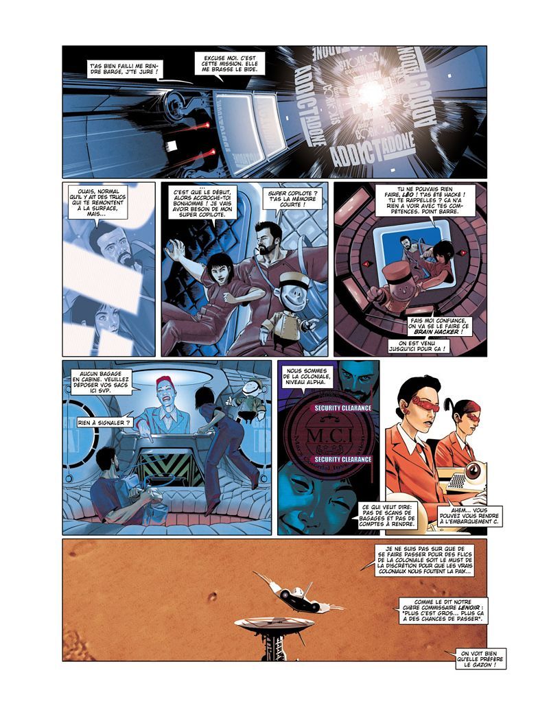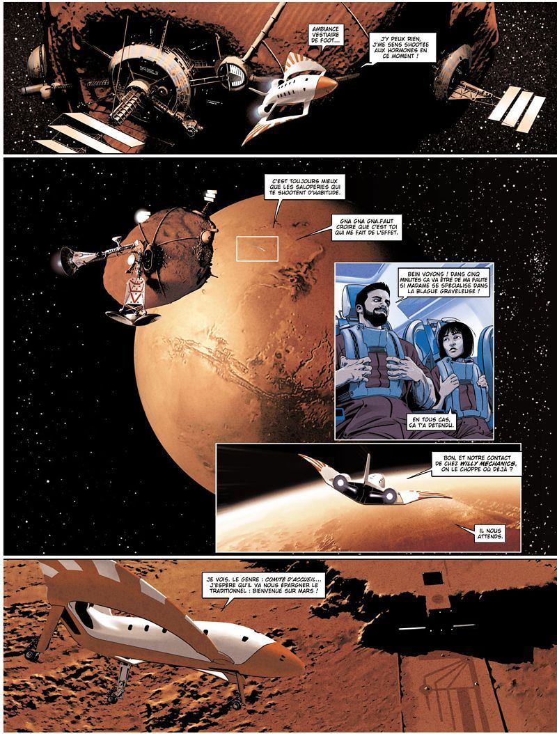 S. L : Les deux. La discussion finale entre Sarah et Léo dans le tome 1 laisse clairement imaginer que la suite devait se passer sur Mars. En plus, c'est vrai que ça me laissait "mon" univers à développer. Deux scénaristes, deux planètes, deux tons. Comme je voulais aussi que les rapports entre les deux héros évoluent, Mars s'y prêtait bien. Il y a aussi un jeu sur les couleurs. D'un côté, la Terre, bleue, froide, avec des rapports distants au tome 1. De l'autre, Mars, rouge, chaude, illustre mieux les rapports des persos dans ce deuxième opus et la fin.
