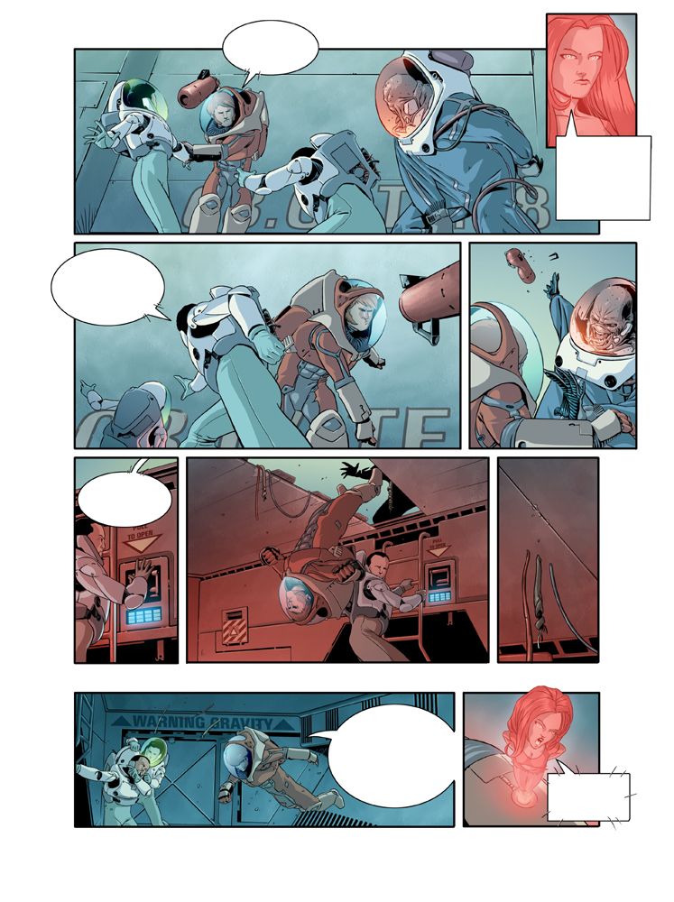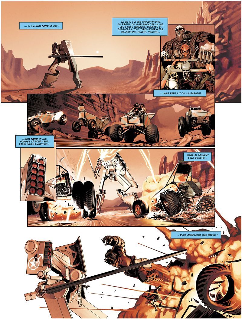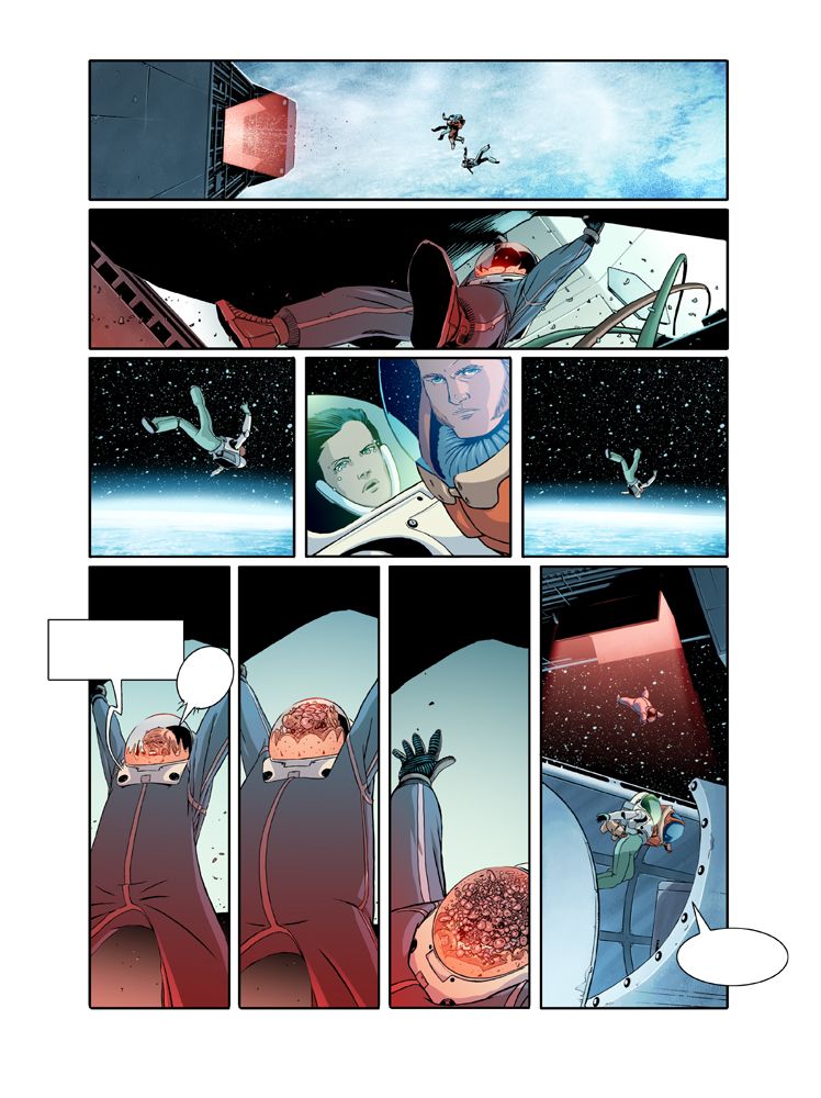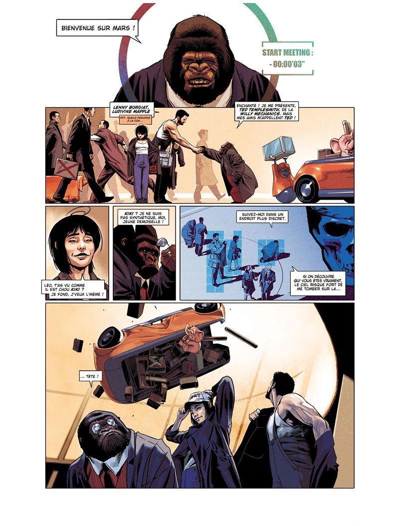 S. L : Les deux. La discussion finale entre Sarah et Léo dans le tome 1 laisse clairement imaginer que la suite devait se passer sur Mars. En plus, c'est vrai que ça me laissait "mon" univers à développer. Deux scénaristes, deux planètes, deux tons. Comme je voulais aussi que les rapports entre les deux héros évoluent, Mars s'y prêtait bien. Il y a aussi un jeu sur les couleurs. D'un côté, la Terre, bleue, froide, avec des rapports distants au tome 1. De l'autre, Mars, rouge, chaude, illustre mieux les rapports des persos dans ce deuxième opus et la fin.