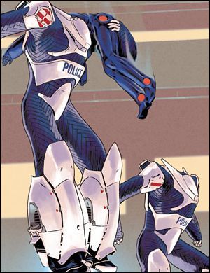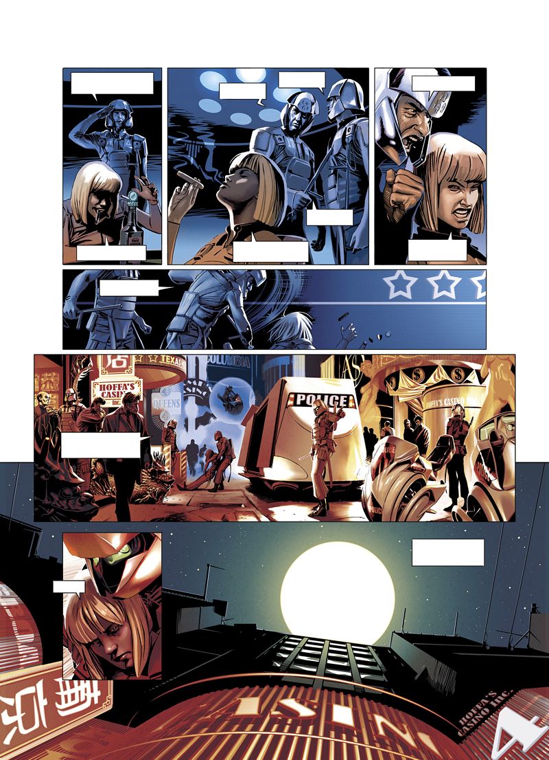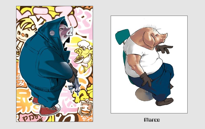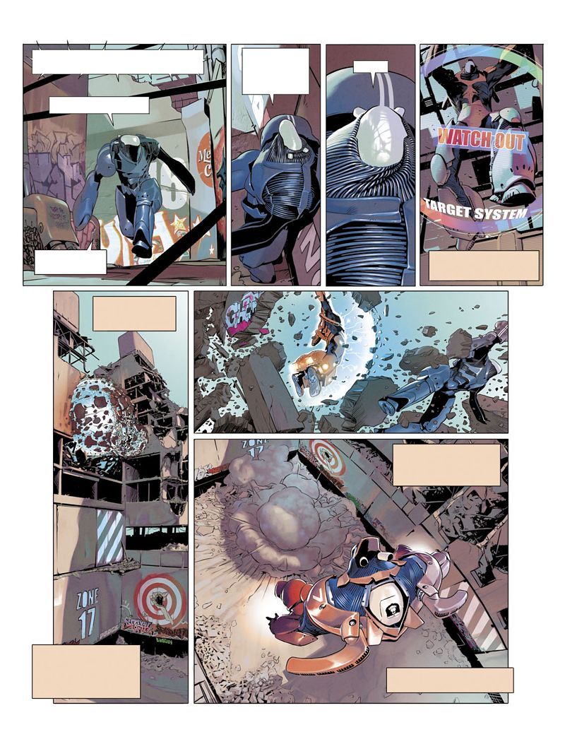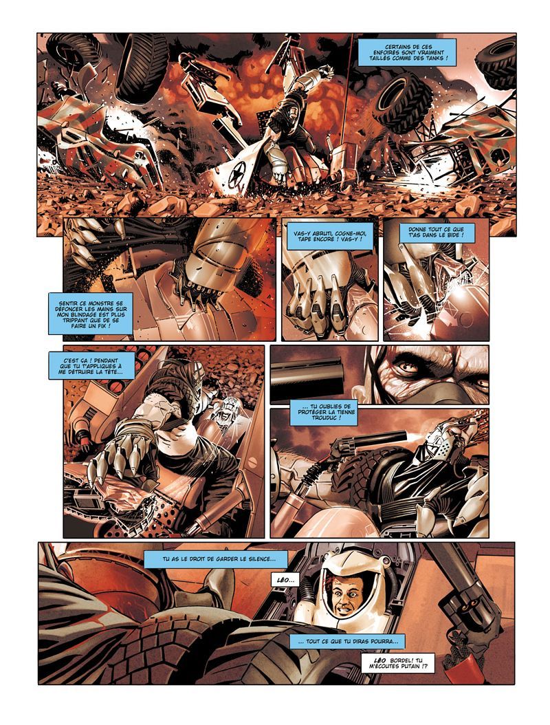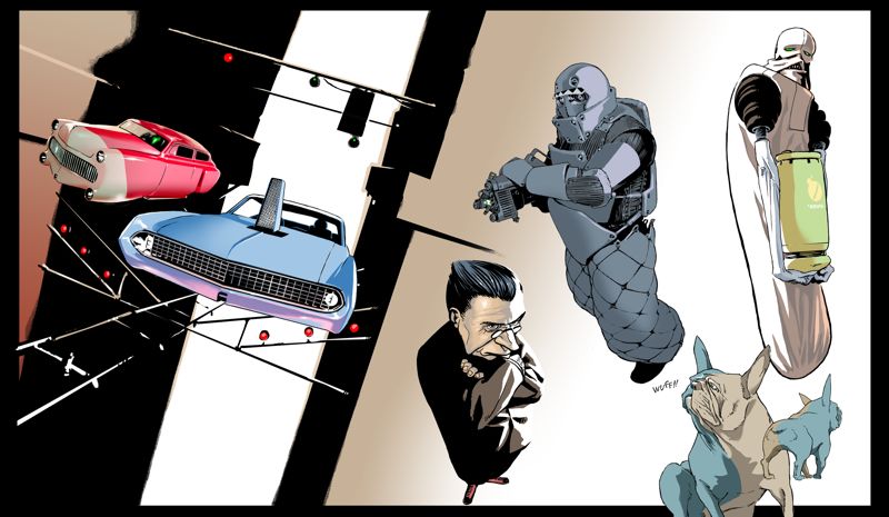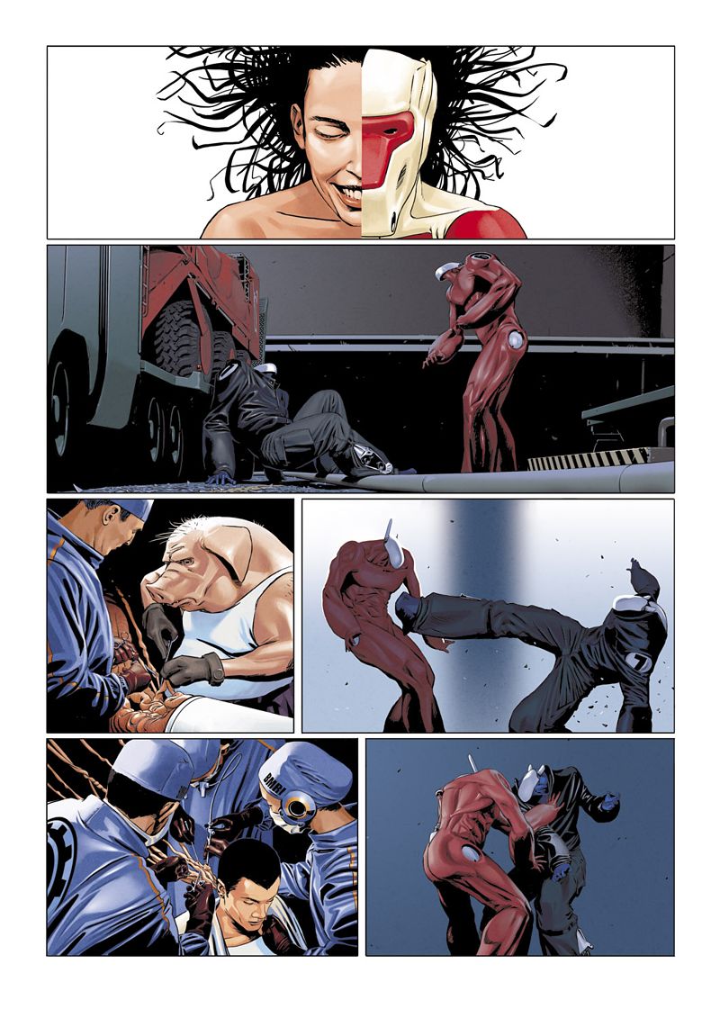 S. L : Avec Arnaud. Il ne faut pas oublier que c'est SON univers, qu'il a posé par petites touches dans le premier volume, comme le fait qu'il y ait des hommes-cochons, ce genre de choses. Le tome 2 se veut plus "grand spectacle", construit comme une super production hollywoodienne, sans limitation de budget. J'ai voulu du grand, du gros, du spectaculaire. Tout ce qui était donc posé au départ s'est vu décuplé. D'ou Ted Templesmith, le gorille et son patron, Oswald, le T-Rex complètement toqué, délirant, et paranoïaque. Entre autre. Les codes cyberpunk, je les connais pour avoir grandi avec, ils font donc partie intégrante de ma culture, et c'est comme une seconde respiration. J'avoue ne pas avoir réfléchis à ça. C'est un peu comme si je me demandais comment parler des jeux vidéos, ou des jeux de figurines stratégiques comme Warhammer 40000. Ça fait partie de moi. Je n'ai donc pas de grand mérite là-dessus. Je suis un enfant de la SF et du Cyberpunk. Je vis depuis que je suis enfant dans mon futur. Celui-ci me rattrapant tout le temps, je dois donc le réinventer tout le temps, et c'est le pied !