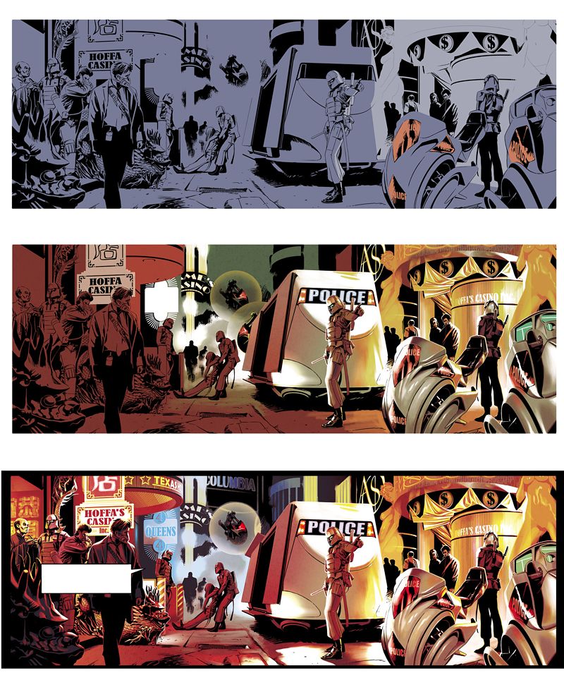 Arnaud Boudiron : Houla ! Mon approche a été d'aller au plus simple ! Même si quelques pages avaient été colorisées en même temps que l'encrage, j’ai eu moins d'un mois pour faire la couleur. Au rythme de 2 à 3 pages par jour, 7 jours sur 7 ! Avec régime et cadence d'un vrai sportif ! (ma femme s'en souvient encore...)