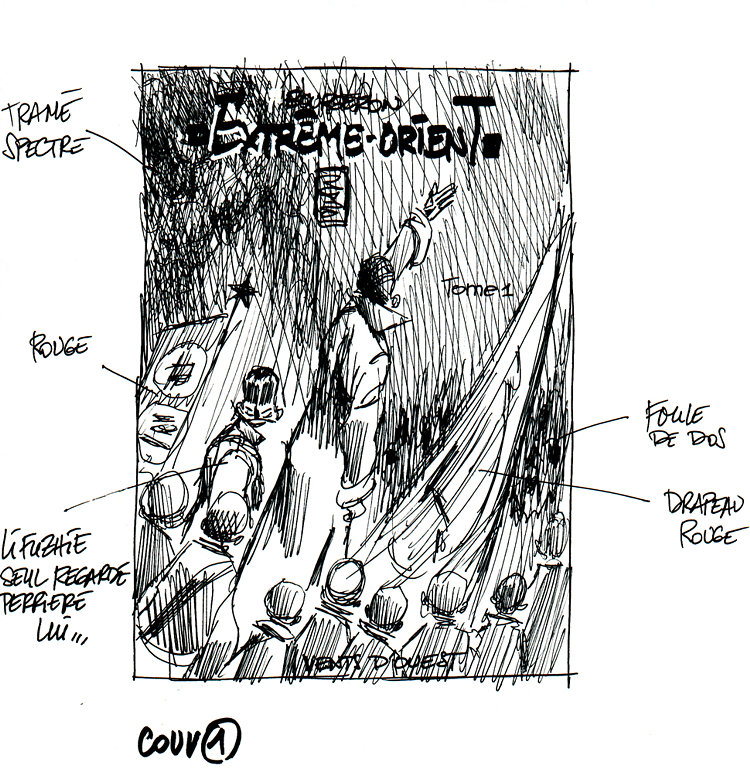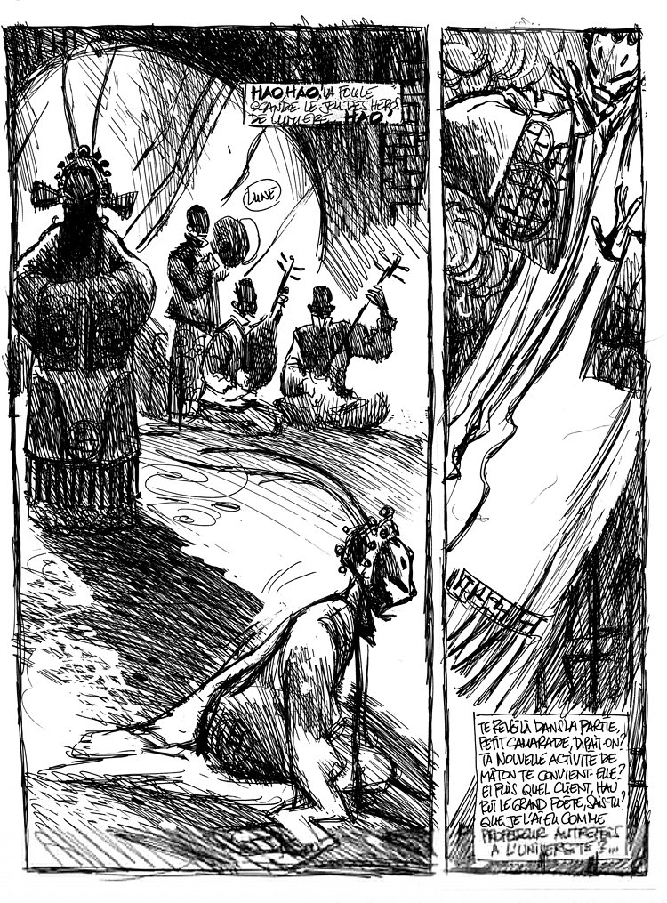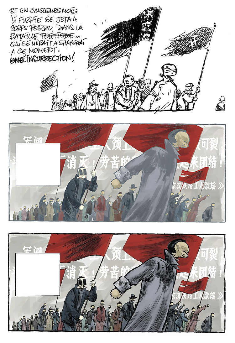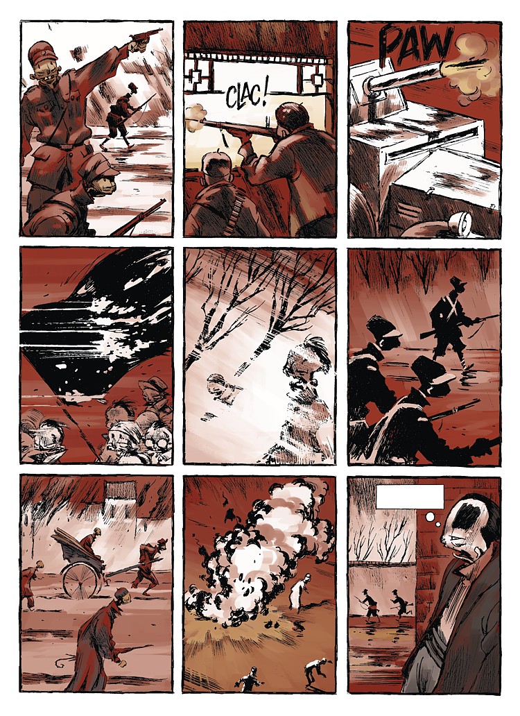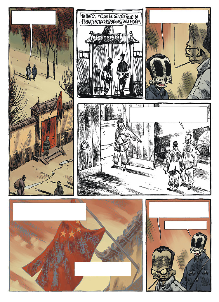 FB : Voilà ! S'il n'y avait pas eu ce texte qui raconte la remontée vers le nord des troupes de Tchang kaï-chek, ben... c'est une période que personne ne connaît ! Enfin que très peu de gens connaissent en France. Il fallait à la fois donner ce texte, et après dans l'histoire mettre en place les éléments narratifs, mais structurer autour de ça des éléments d'Histoire, fallait pas que ça soit chiant... c'était ça le boulot du tome Un : mette en place la structure. Évidement je sais bien qu'il y a quelques imperfections, il y a des petits trucs qui ne marchent pas d'un point de vue scénaristique, des petits aller-retour, des ellipses un peu fortes...