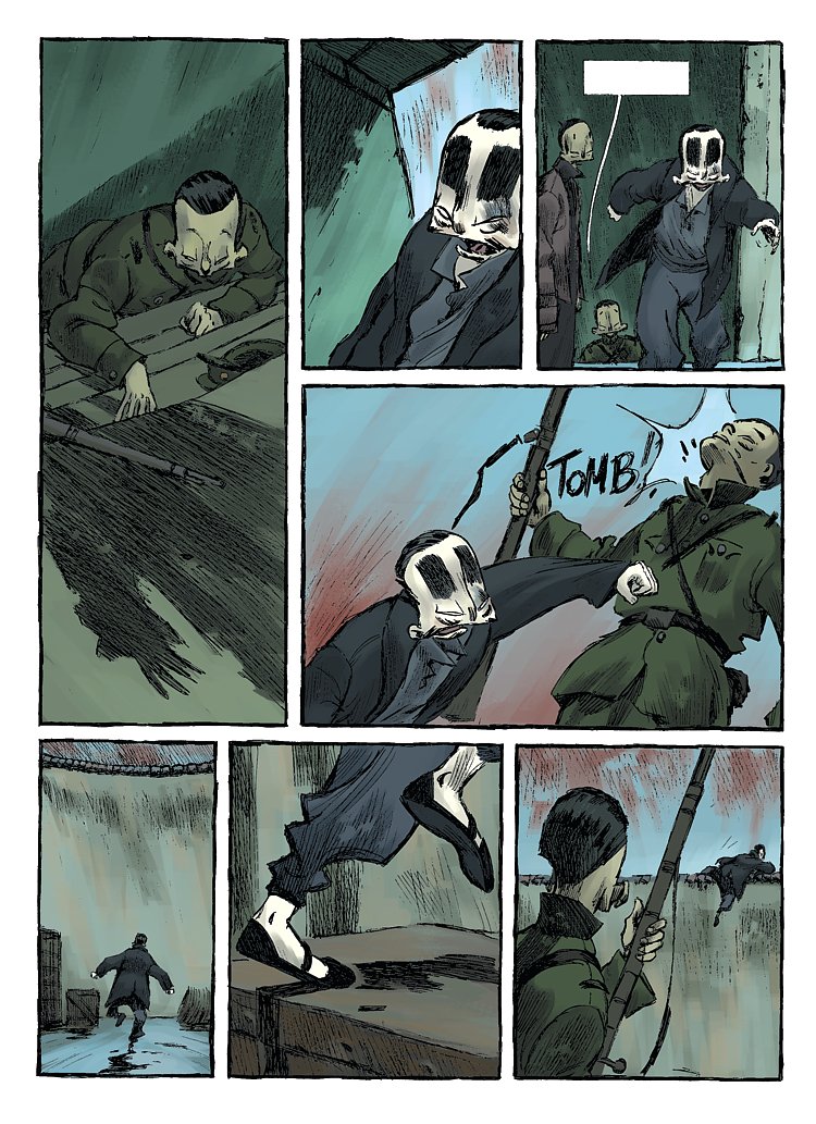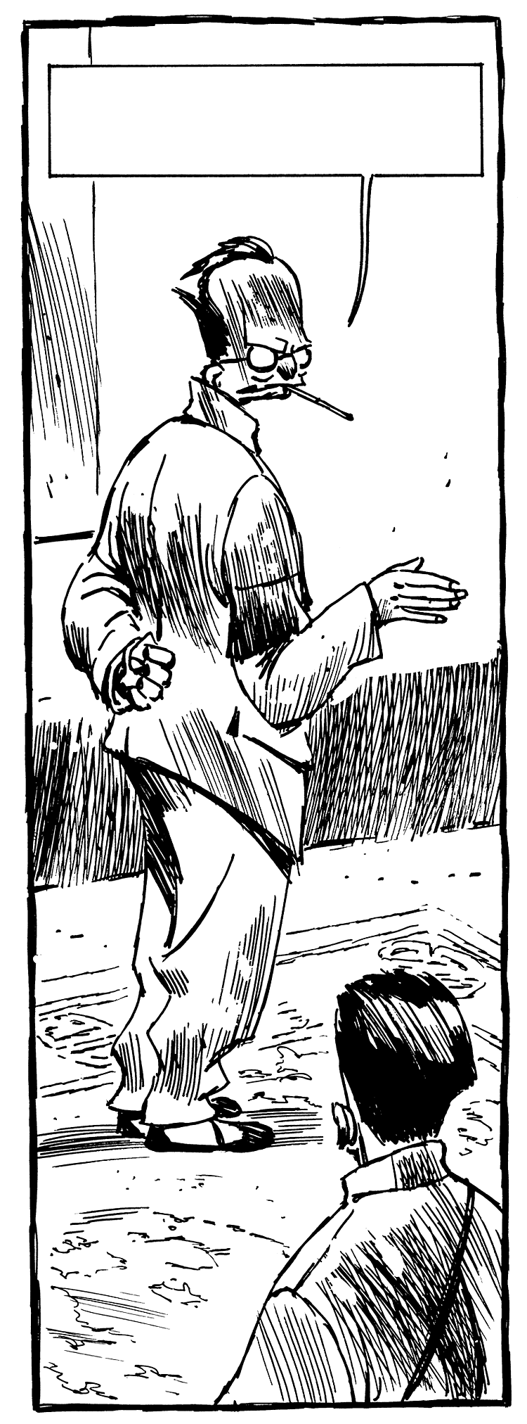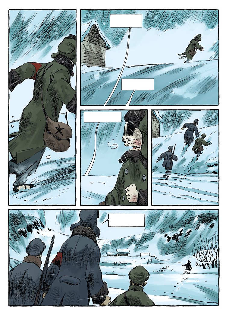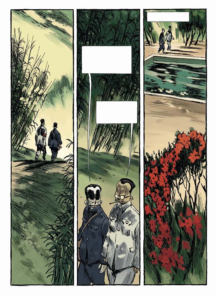 FB : Voilà ! S'il n'y avait pas eu ce texte qui raconte la remontée vers le nord des troupes de Tchang kaï-chek, ben... c'est une période que personne ne connaît ! Enfin que très peu de gens connaissent en France. Il fallait à la fois donner ce texte, et après dans l'histoire mettre en place les éléments narratifs, mais structurer autour de ça des éléments d'Histoire, fallait pas que ça soit chiant... c'était ça le boulot du tome Un : mette en place la structure. Évidement je sais bien qu'il y a quelques imperfections, il y a des petits trucs qui ne marchent pas d'un point de vue scénaristique, des petits aller-retour, des ellipses un peu fortes...