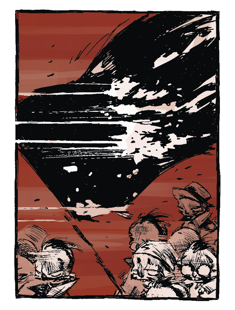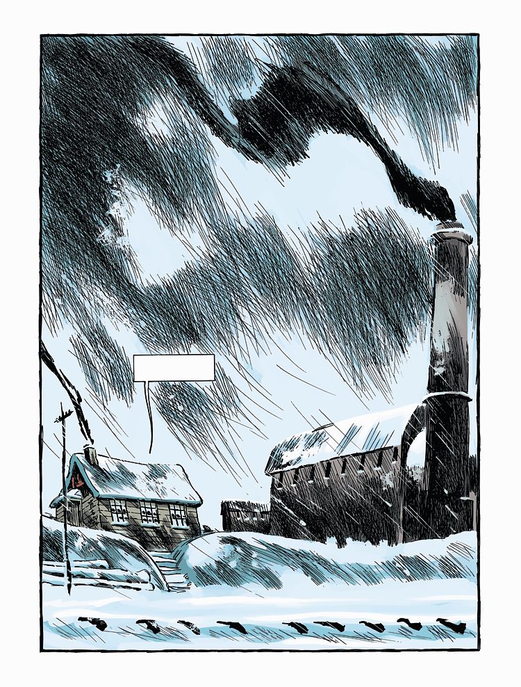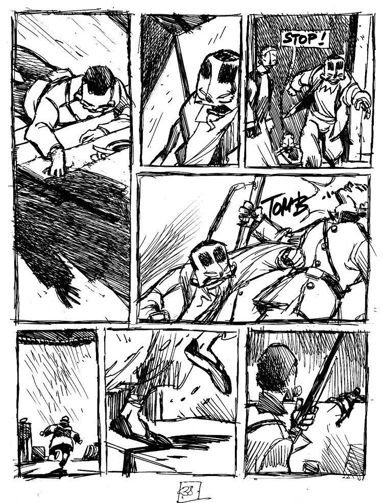 FB : Mon trait, c'est différent. D'où il vient ? C'est vachement difficile pour moi de dire... c'est un truc que j'ai travaillé ! Je voulais trouver un trait assez dur, assez rude. Mais c'est aussi ma manière de dessiner, presque naturelle. Je le fais pas " à la manière de... ", c'est une envie que j'ai de dessiner comme ça et que ça me vient quand je dessine au téléphone. Je pense que j'ai un trait qui ressemble à ça. C'est ma nature, c'est la personnalité d'un individu. Quand au découpage, j'essaie de découper le plus simplement possible, je ne veux pas faire " d'effets ". J'essaie d'être au service de l'histoire et d'être le plus lisible possible. J'ai l'impression d'avoir un découpage classique !