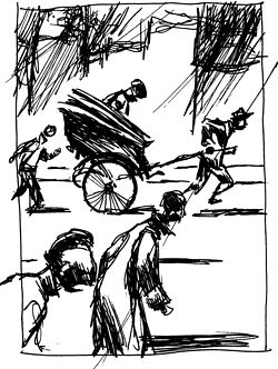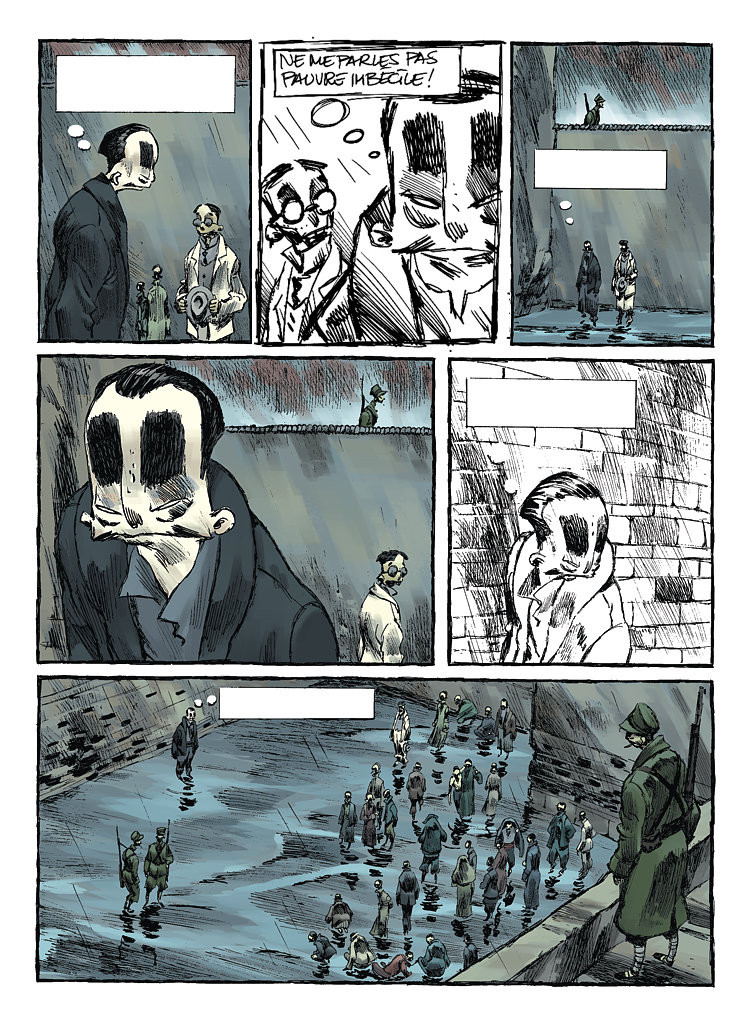 FB : Les deux. En fait quand j'ai pris la décision de le faire, j'ai potassé avec Internet et j'ai essayé de retrouver un maximum d'images liées à ça. Et y'en a beaucoup en fait ! Ca m'a donné un stock d'images important, avec une tonalité générale. Evidemment le côté noir et blanc, mais il y avait aussi comment étaient habillés les gens, etc. Au fur et à mesure ça me donnait une ligne graphique, il s'agissait de traduire ça. Après, une fois que je me suis mis à dessiner les planches, je n'ai plus regardé mon stock d'images, mais ça m'a vachement nourri dans l'attitude des gens, comment ils se comportaient. Il se dégage de ça quelque chose, une espèce de ligne générale que j'essaie de retranscrire. Après, tout ce qui était autour, l'organisation historique, tout ça... il a fallu potasser sérieusement le truc pour que ça tienne dans l'histoire. Et puis surtout il fallait donner au lecteur le cadre général sans être chiant, sans être didactique...