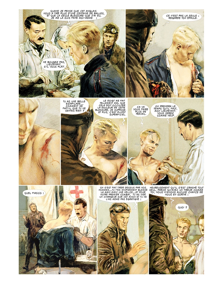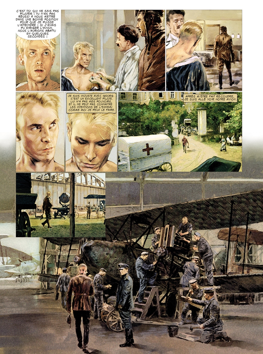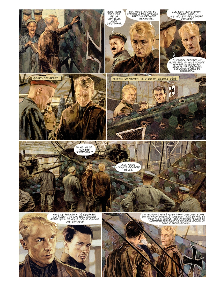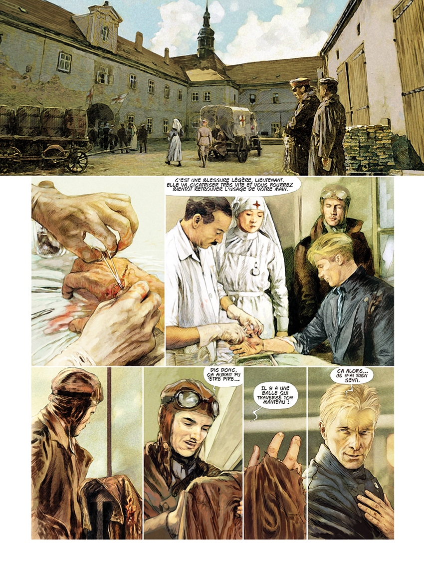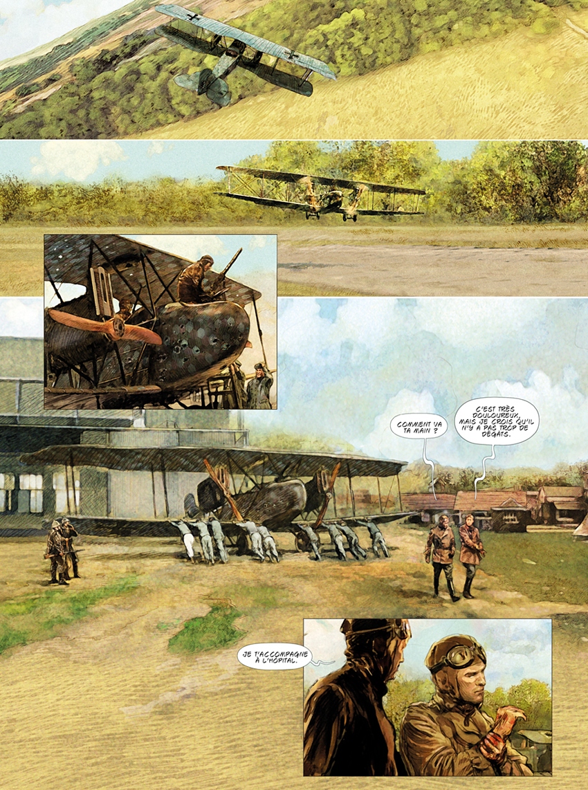 Carlos Puerta : Après avoir fait chez Zéphyr les deux histoires courtes dans Emergency 1 et 2, Pierre et moi, avons parlé de la possibilité de faire une autre histoire plus longue chez Zéphyr, car Alex (l'éditeur) était intéressé par notre travail. Il est clair qu’il aime le monde de l’aviation, alors j’ai pensé immédiatement au Baron Rouge. Le sujet me plaisait beaucoup, et le personnage était passionnant, de telle façon que, à la fin, j’ai fini, comme toujours, en faisant quelque chose d’époque. Conclusion : beaucoup de travail, trop de documentation et peu de temps, mais un grand plaisir. Et, comme d’habitude, Pierre avait pensé la même chose.
