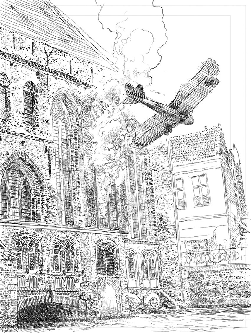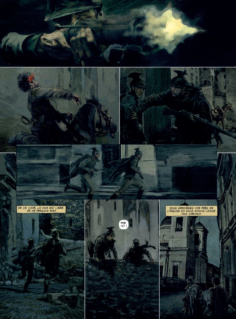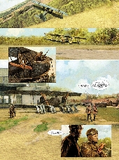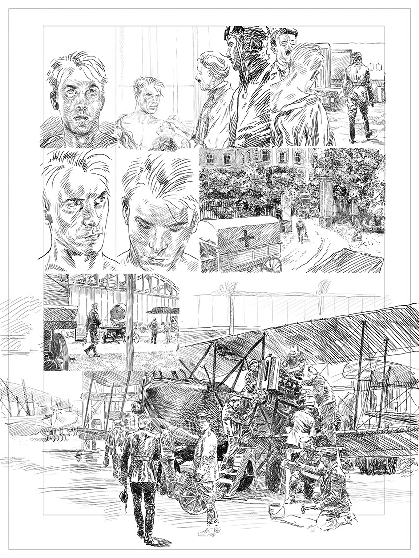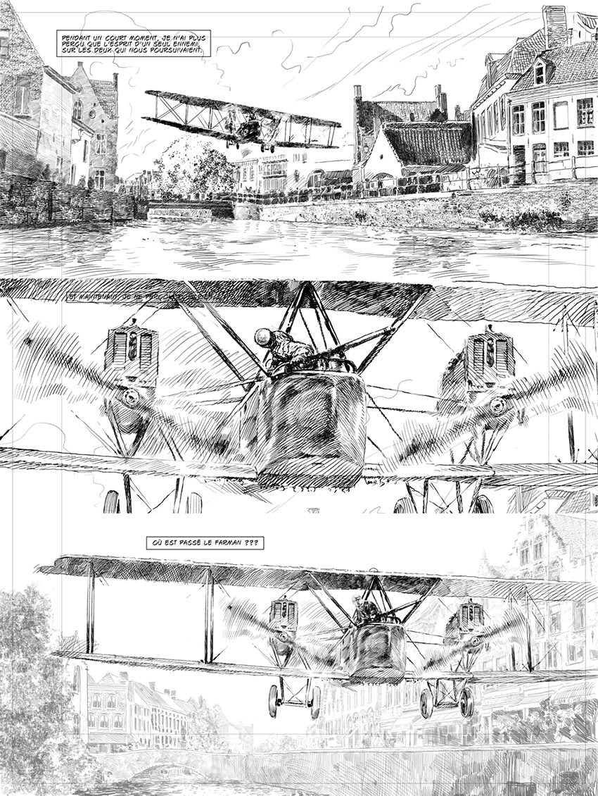 CP : Je suis très à l’aise en travaillant avec Pierre. On parle de ce qu’on veut faire, de l’idée qu’on veut raconter, et après, Pierre m’envoie un scénario technique avec des indications assez simples, me laissant toute liberté pour faire le découpage. En plus, il m’envoie aussi la documentation qu’il a trouvée en écrivant, et je l’ajoute à celle que j’ai obtenu de mon coté. Le travail de recherche, la documentation, c'est ce qui'il y a de plus lourd avant même de faire les crayonnés ( des avions, des uniformes, des armes, des localités, etc...).
