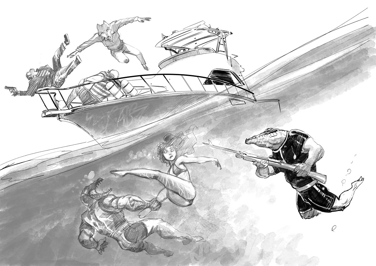 Stephen Desberg nous a fourni une iconographie abondante pour illustrer son interview. N'ayant pu tout utiliser, nous vous proposons un portfolio d'illustrations et de dessins préparatoires d'Henry Reculé pour leur nouvelle série : Jack Wolfgang.