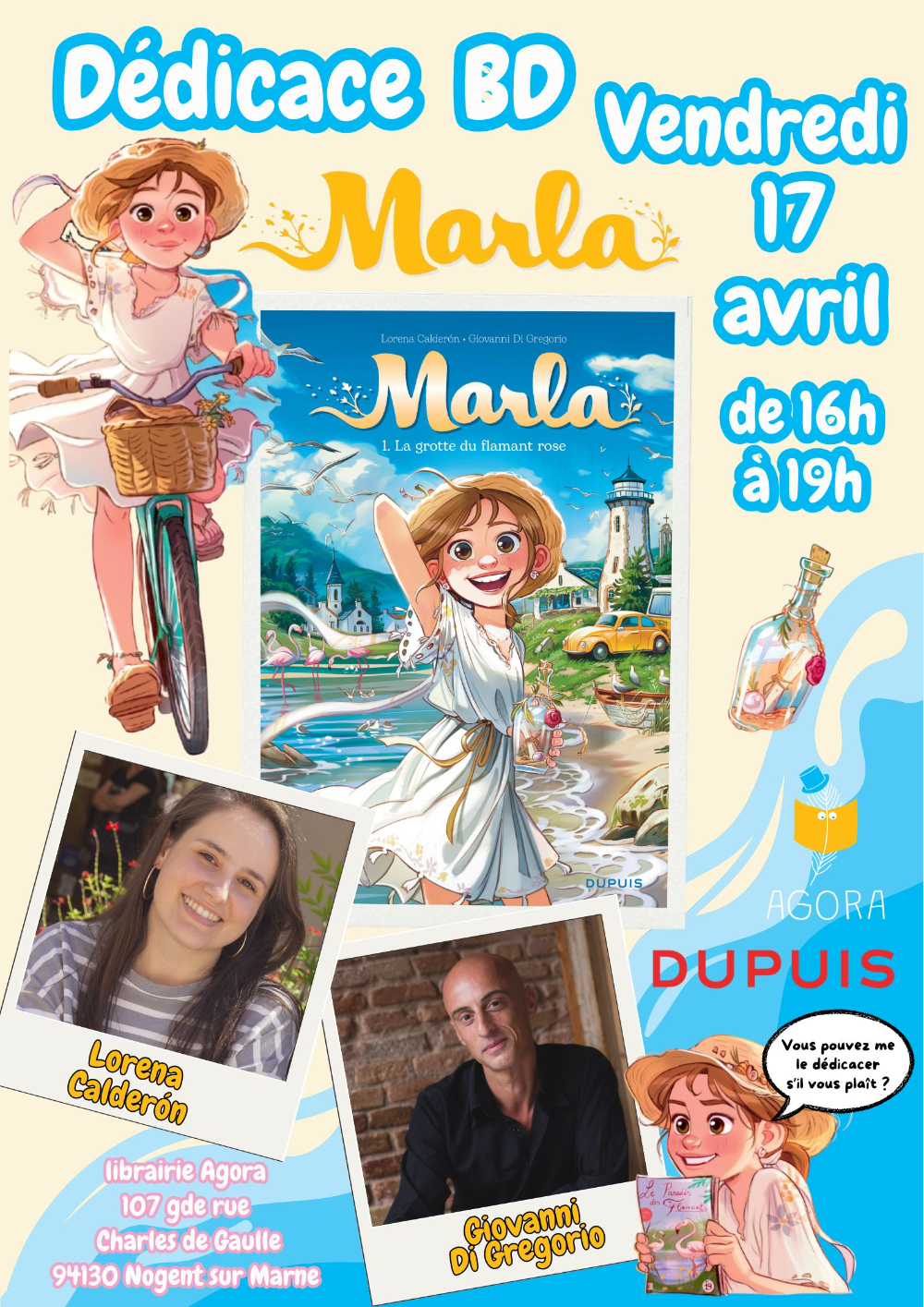 Nous avons l'immense plaisir d'accueillir les auteurs Lorena Calderón & Giovanni Di Gregorio (scénariste de la série Les soeurs Grémillet) le vendredi 17 avril 2026 de 16h à 19h pour une séance de dédicace en avant-première pour le tome 1 de Marla aux éditions Dupuis. Entrée libre et gratuite pour tous