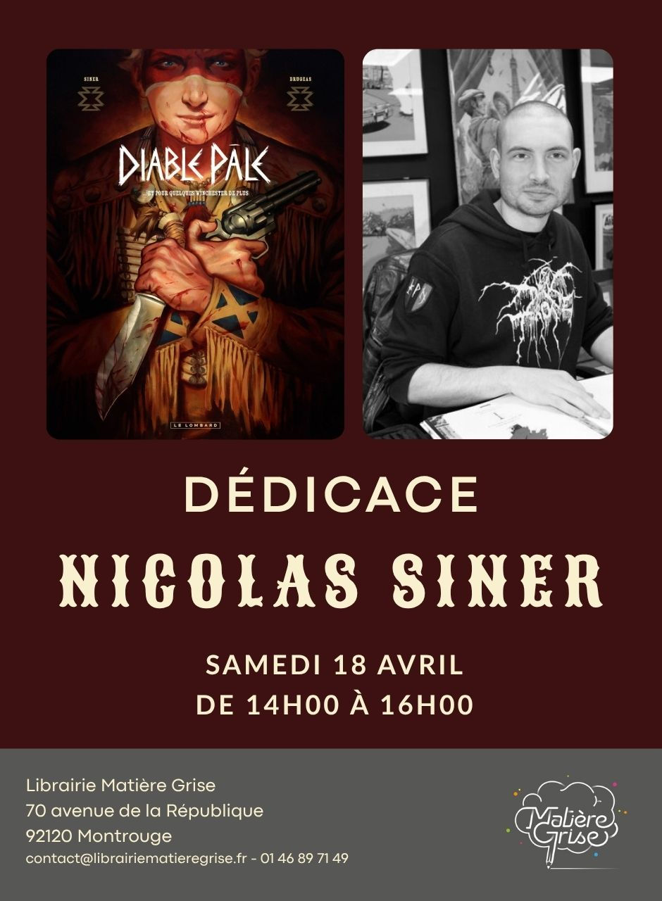 Nous sommes ravis de vous annoncer que Nicolas Siner sera parmi nous le samedi 18 avril 2026 de 14h à 16h pour dédicacer son nouvel album Diable Pâle, scénarisé par Vincent Brugeas. Au plaisir de vous y voir nombreux ! Dédicace sur réservation