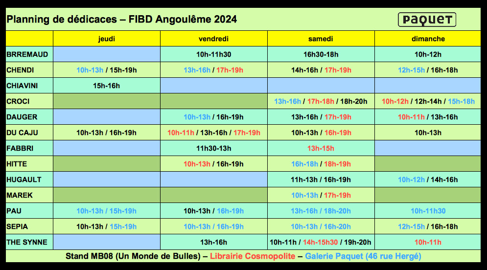 Même avis par ici concernant Casterman : j'en avais déjà un mauvais souvenir de mes précédentes éditions (il s'agissait cette année de mon 9ème Angoulême), et cette nouvelle n'a fait qu'enfoncer le clou. J'ai tenté à cinq reprises (!) de décrocher une dédicace pour Jacamon/Le Tueur (présent sur encore plus de créneaux au cours de ces quatre jours) et je l'ai raté les cinq (!). Je n'avais encore jamais essuyé une telle déculottée. En cause ? Une organisation lamentable, à tel point qu'elle en devient presque suspecte. C'est bien simple, pas un seul interlocuteur ne me donnait les mêmes infos que son collègue sur l'horaire auquel venir/la stratégie à adopter. Je ne parle bien évidemment pas ici des créneaux de 10h (pour lesquels il s'agit de se pointer à 6h du mat devant la porte principale, puis courir plus vite que ses concurrents, voire les bousculer - je n'invente rien), mais de tous les autres, où, pour un même créneau, un premier membre du staff va te dire un truc, puis cinq minutes après un second va te dire le contraire.