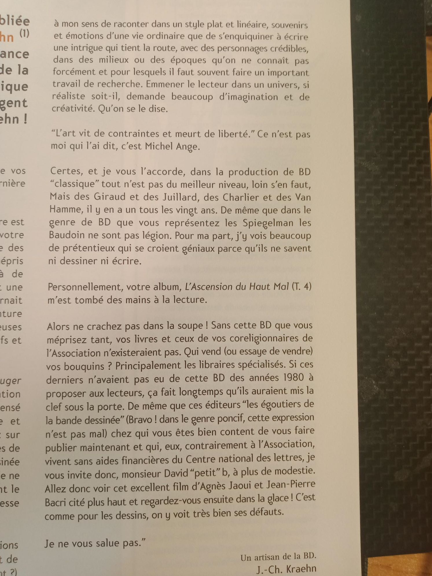 Kraehn, c'était la BD classique, tendance Vécu, avec de la fesse pour faire sérieux, comme si foutre des femmes à poil représentait la passeport pour être pris au sérieux. Sans rire, la scène de cul quasi contractuelle de Glénat n'a pas aidé la bande dessinée à être prise au sérieux![]()