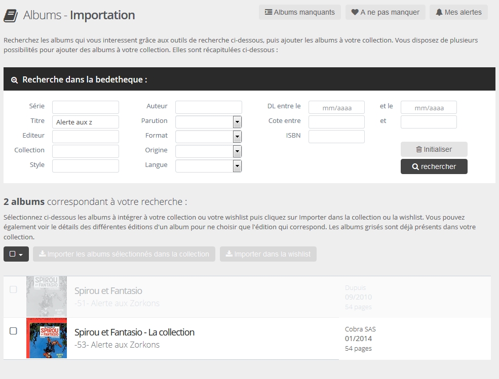 1 - Sur la page d'accueil de BDGest Online, il existe champ "Importer un album", c'est donc celui la que j'avais utilisé. 2 éditions sont proposées. Le 51 et le 53. Pas les 51xxx.