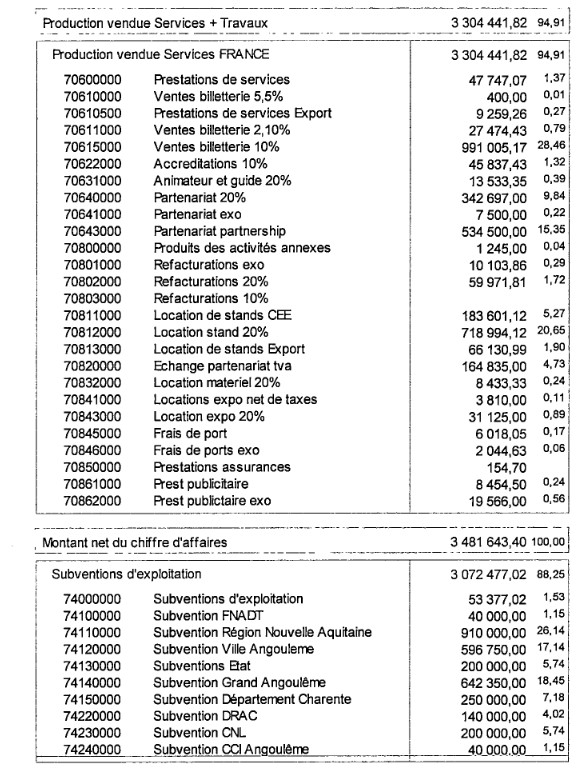 - 2,4 millions€ en sous-traitances, pour le site web, pour la scénographie. Et puis il y a des sujets fourre-tout comme 850k€ de sous-traitance générale par exemple, outre les prestations du directeur de 106k€, de 200K€ de prestations techniques, de 100k€ de création. En gros on peut mettre n'importe quoi dedans pour passer inaperçu.
