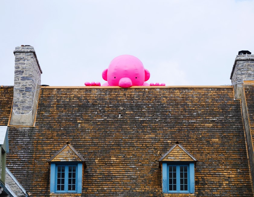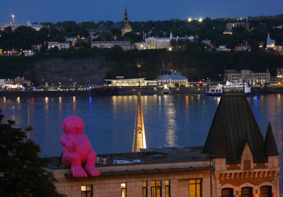 en parlant de ça, y'avait une expo / installation de Philippe Catherine à Québec cet été. Des gros bonhommes roses gonflables un peu partout dans la vieille ville, accrochés aux façades, dans des arbres, sur des toits...