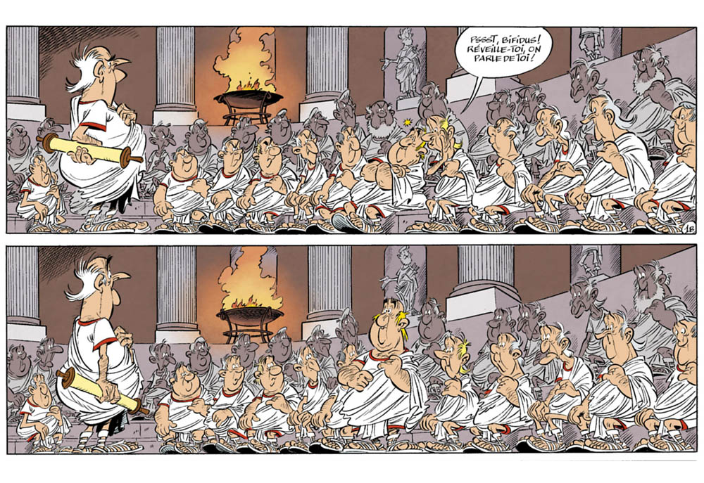 alambix a écrit:Je le répète, le placement dos/jambes du sénateur en bas de la planche 1 est raté. Il est exactement dans la même position à la page suivante et là c'est réussi.