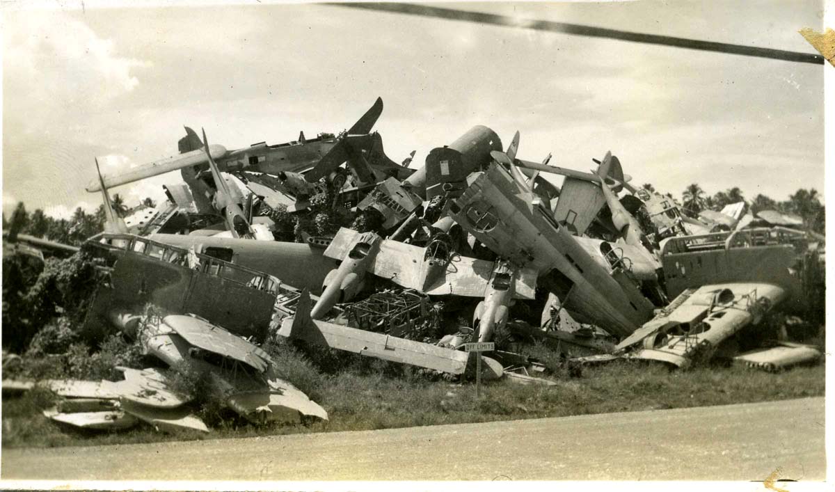 On voit ici une partie de ces avions, le lendemain, 8 avril 1945, à Iwo Jima.