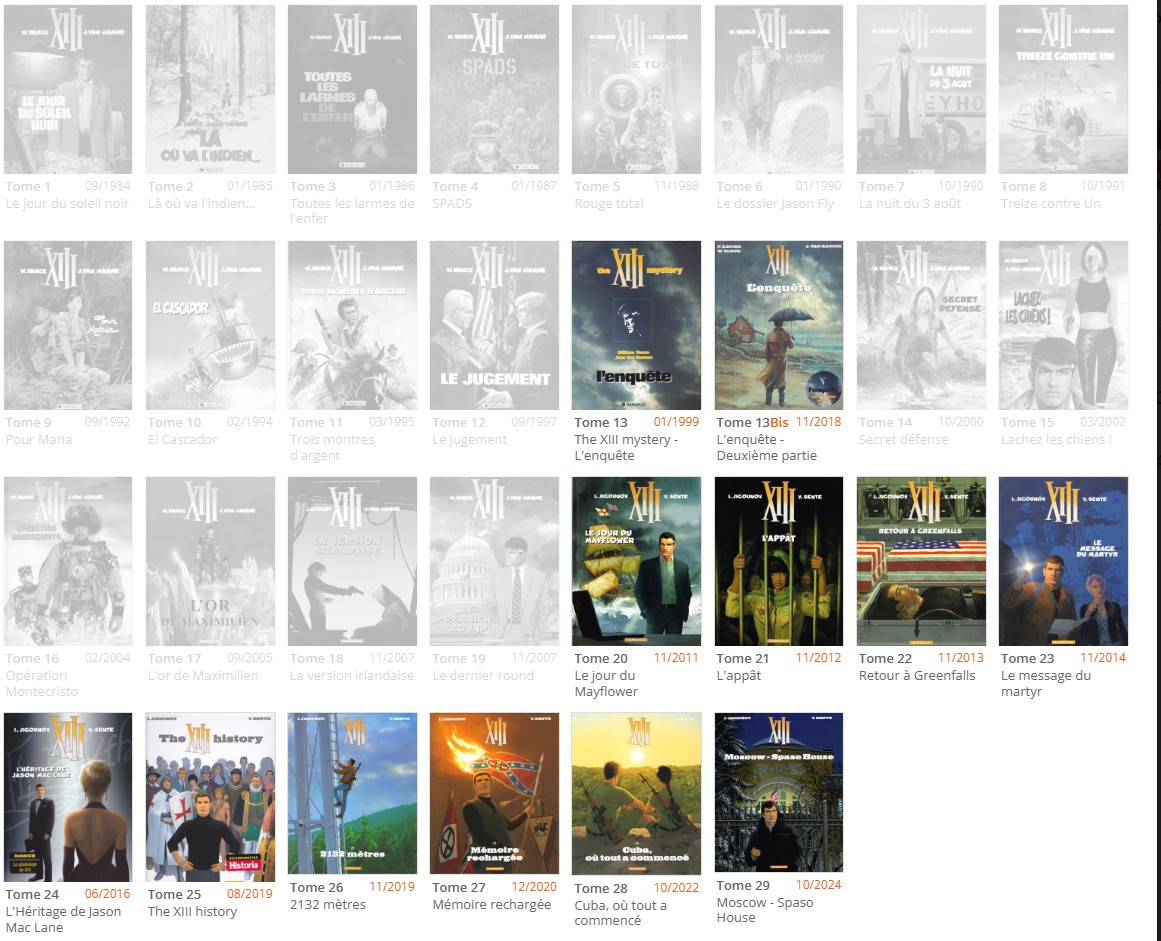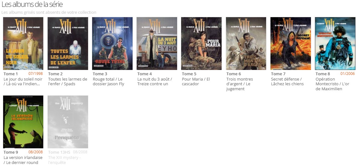 J'ai les 18 premières histoires (l'époque JVH) en albums doubles France Loisirs, et le reste de la série en album classiques Dargaud y compris les hors série 13 et 13bis