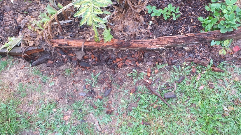 Certains bois délimitant les parcelles du potager et en état de pourrissement partiel sont déterrés et "griffés " cassés sans doute pour récupérer des larves d'insectes