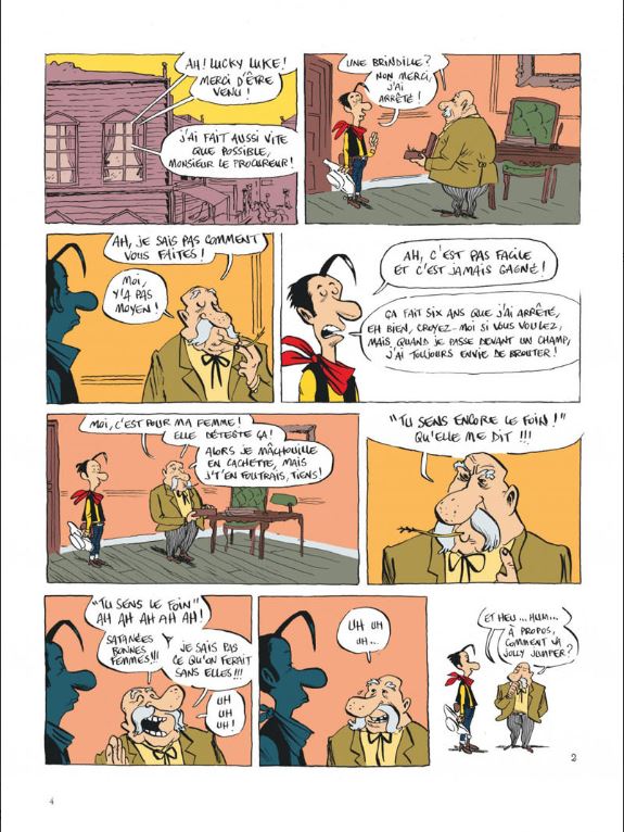 (*)tout en préservant un décalage qui est propre à son album à lui, mais il a parfaitement compris et assimilé la technique qui donne son ton à la série (par exemple l'escalade des menaces de Joe envers Luke, qui culmine avec « Je vais me raser dans sa baignoire ! »).